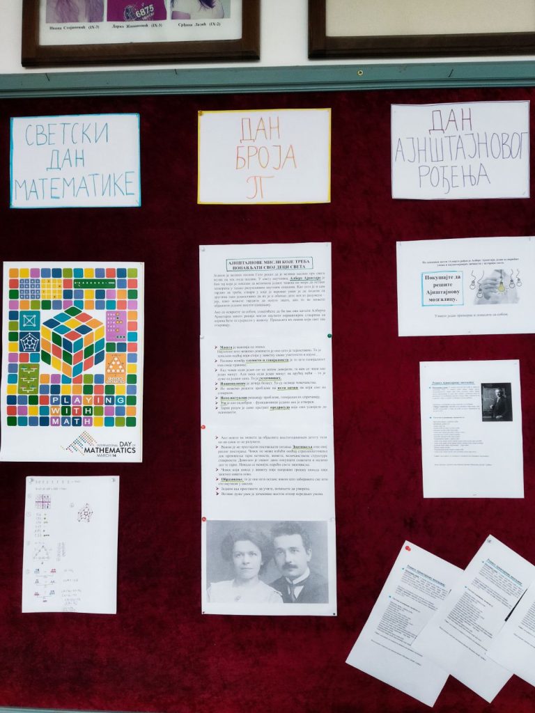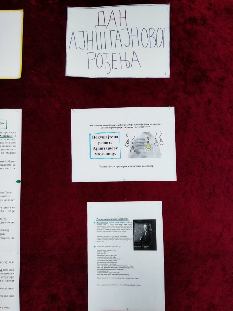 Дана 14.марта у нашој школи је обележен Међународни дан математике, дан броја π и годишњице рођења Алберта Ајнштајна. Наставница физике Милијана Дачић и наставник математике Томислав Благојевић припремили су за ученике, љубитеље ова два предмета, занимљиве мозгалице и квизове.💡