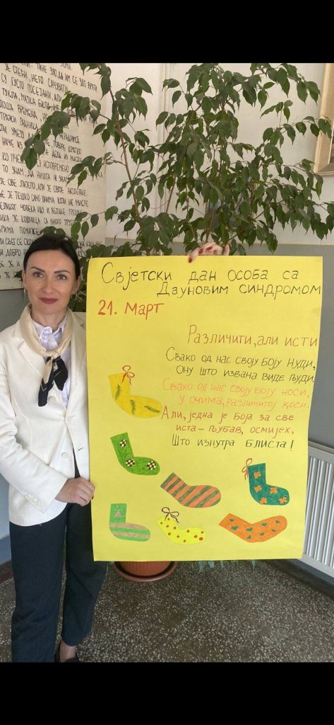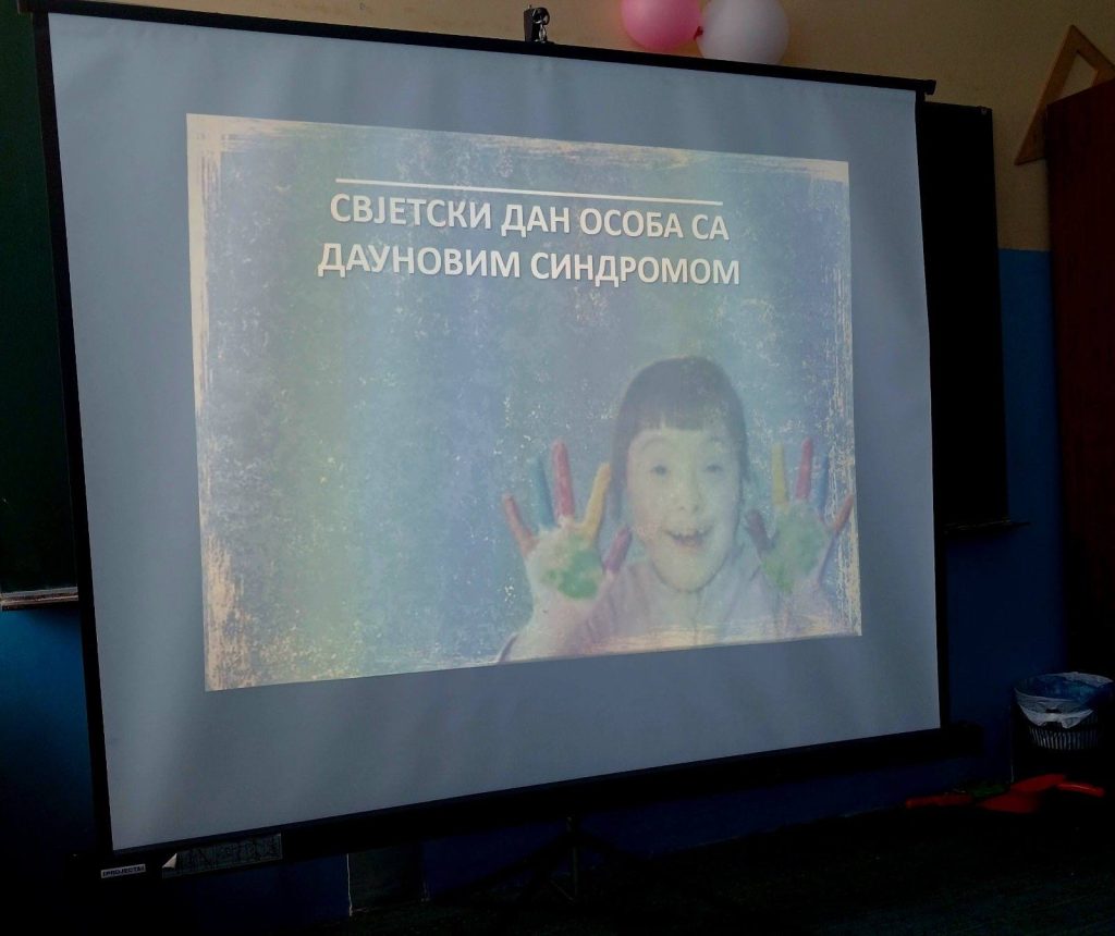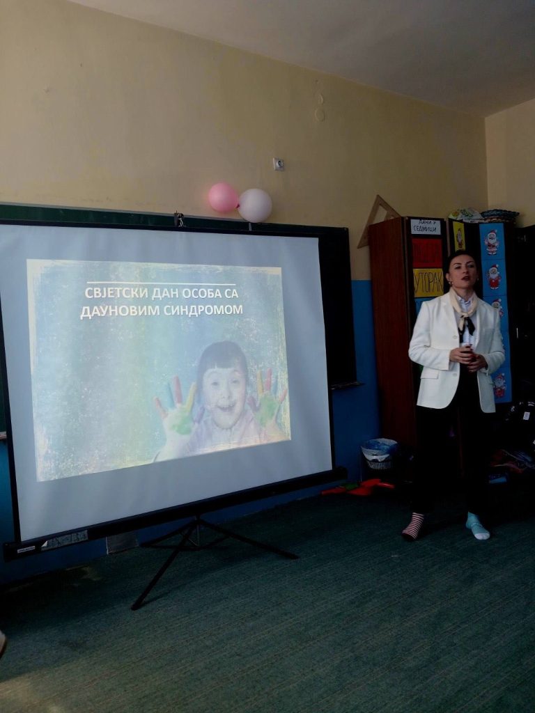 Данас су ученици одељења са посебним васпитно- образовним потребама припремили пано за своје најмлађе другаре из првог разреда и на сликовит начин, приказали како можемо помоћи особама са овим проблемом. Захваљујући дефектологу наше шкoле, наши најмлађи ученици су погледали поучну презентацију на ову тему и схватили да и они могу дати свој допринос и бити извор подршке особама са Дауновим синдромом.
