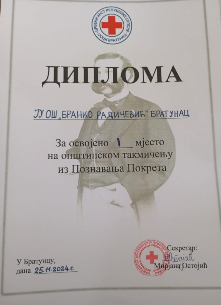 25.11.2024. Општинско такмичење из Познавања Покрета Црвеног крста – ПРВО МЕСТО (Ученици: Исидора Кркељаш, Матеја Станимировић и Давид Радошевић. Ментор: учитељ Брано Стојановић.)